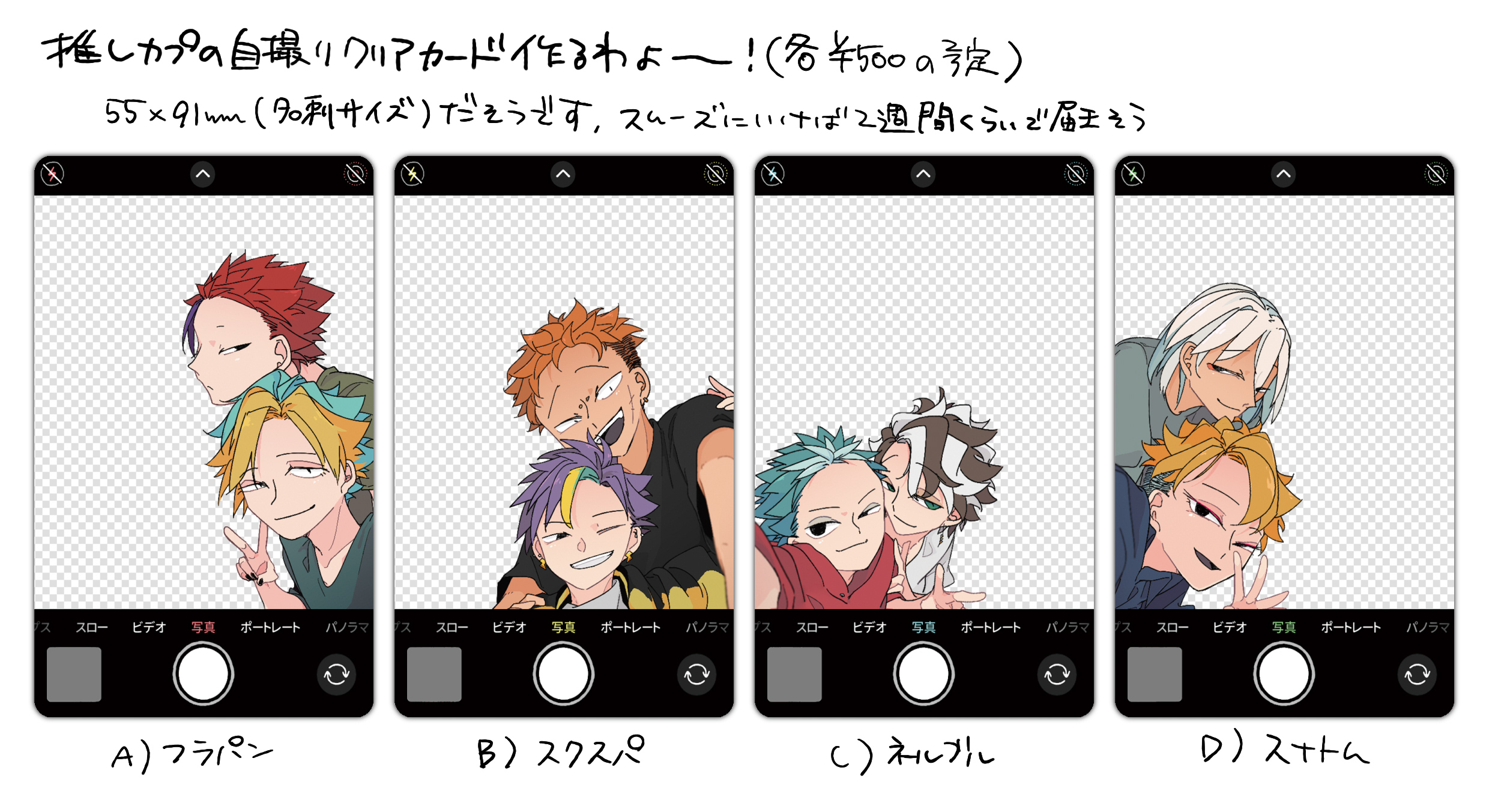 グッズが出ます!!!!(急) 最近絵を更新しないと思ったらグッズの絵描いてました こういう透明のカードを作ります クリアカードというらしいな 持ち歩いて写真撮ったりするやつです 前にも話出てたんだけど忘れ去ってたので思い出した今でGO 一応さっき印刷所から2/11納品予定って連絡あったので何か甚大なミスが起こらなければそのくらいになるぽいのでまた頒布開始のタイミングでお知らせします!た~のしみ~~