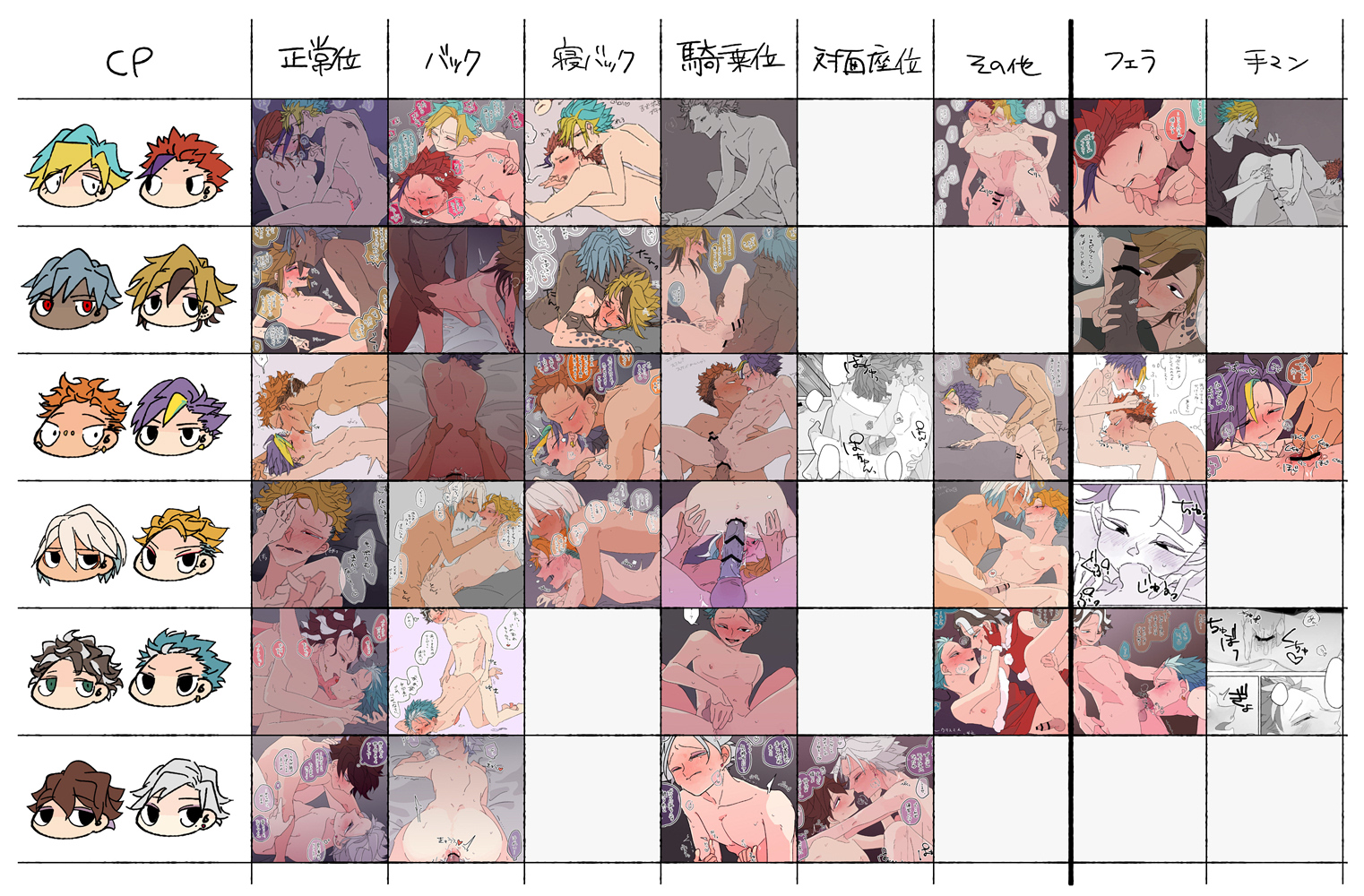 あてかその前にこれこれ 推しカプ体位ビンゴ(あとからフェラと手マンの欄も足したけど)を作って遊んでたんすよ んで穴埋めがしたいなと思ってバックでなさっているシュバリカを描いた次第なんだけど 結構どのカプも描いてて草 始めたてのやさシベすら割と埋まっているしスクスパに至ってはコンプしている 弊擬におけるドスケベCP大使に任命します 一番歴の長いフラパンもリーチなんだけどこいつら逆体格差なので対面座位しようものならフラの棒切れみたいな脛が折れちまうんだよな 無念 がんばれ