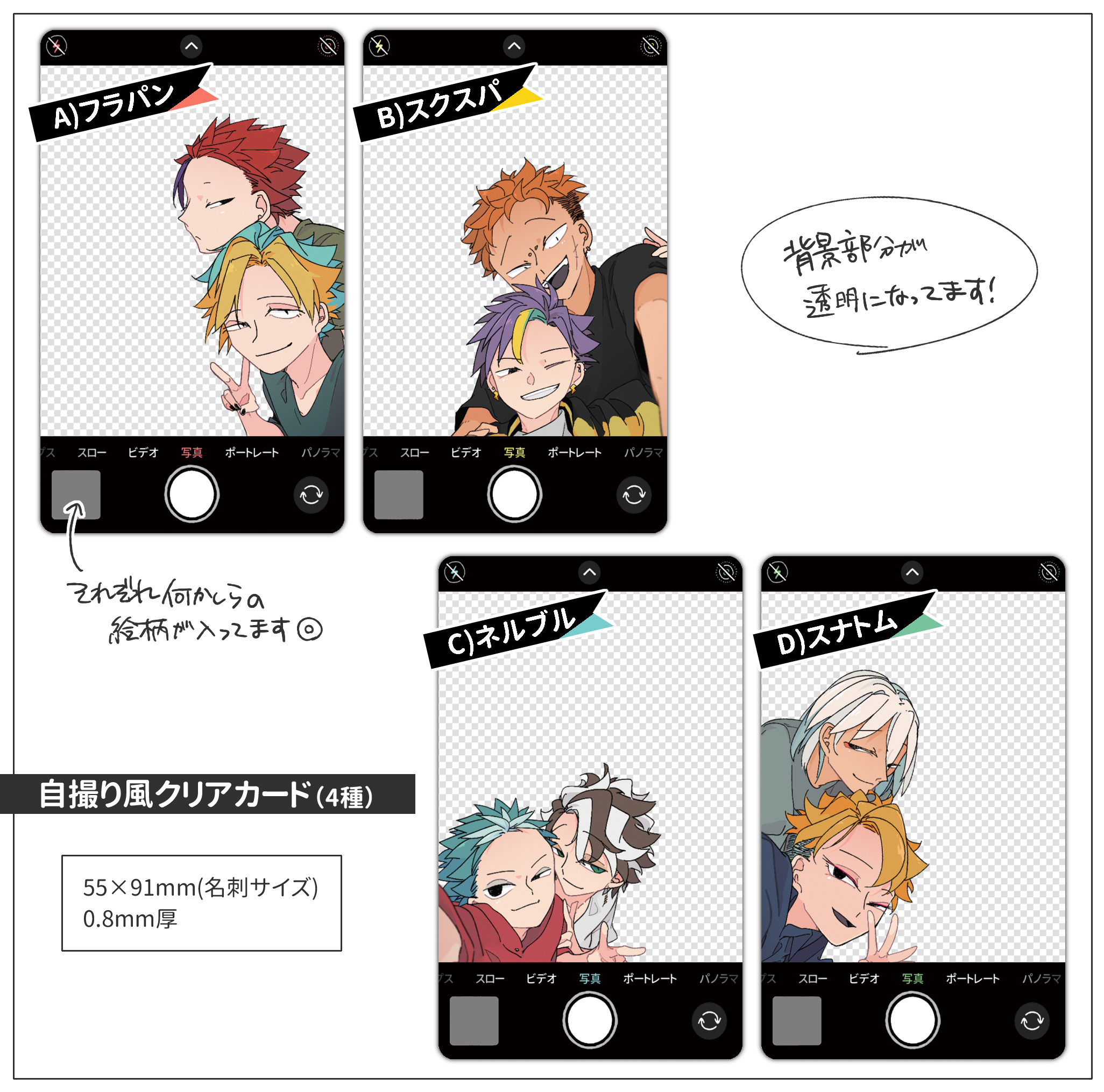 OFFLINE(G) OFFLINE イベント参加予定 未定 過去の参加イベント過去の参加イベント 20220918 ALLSTAR19@東京ビッグサイト ★ 20230924 ALLSTAR23@東京ビッグサイト ★ 20240715 ALLSTAR25@福岡マリンメッセ ★ 20241027 ALLSTAR26@東京ビッグサイト ★ 20250518 SUPER ALLSTAR2025大阪@インテックス大阪 ★ ▼WEB 20201122 レクジャスWEBオンリー「チョーお盛んなお年頃」 20211212 どう森WEBオンリー「ボクらの村においでよ」 20230115 あつ森WEBオンリー「ハッピースローライフ」 20241012 オールジャンル多角関係WEBオンリー「両手繋いで2」 ★ 20250802 オールジャンル墓参りWEBオンリー「あなたに会いに来ました2」 ★ BOOKS GOODS キザコワ自立アクスタ キザコワ6人組の集合写真ポーズ風アクスタです。 8mm厚のアクリルとなっており、台座なしで自立します。 BOOTH 2025卓上カレンダー 表紙+12枚=13枚組の台紙付き卓上カレンダーです。 用紙ははがきサイズです。 BOOTH 自撮り風クリアカード 全4種(フラパン・スクスパ・ネルブル・スナトム)。 背景部分が透明です。 SOLD OUT