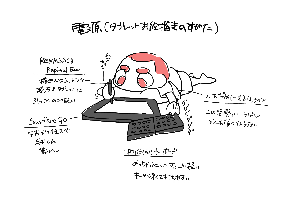 それと描き心地の話でもうひとつ、姿勢が難しい!普段はデスクトップPCに板タブなので真っ直ぐ前向いて描いてるんよ それがタブレットになるとノート書くみたいなこう…机に置いて下を向く格好になるので首が悪くなりそ~~…!とは思った 途中から寝転がったらどうなのか試したけどこれが一番良かった、うつ伏せで腹の下に人をダメにするやつを置いてやると腰の負担も大して感じず疲れにくい感じでした タブレット使う時は腹の下にクッション置いて転がって描くぜ 頑張って慣れよう~~