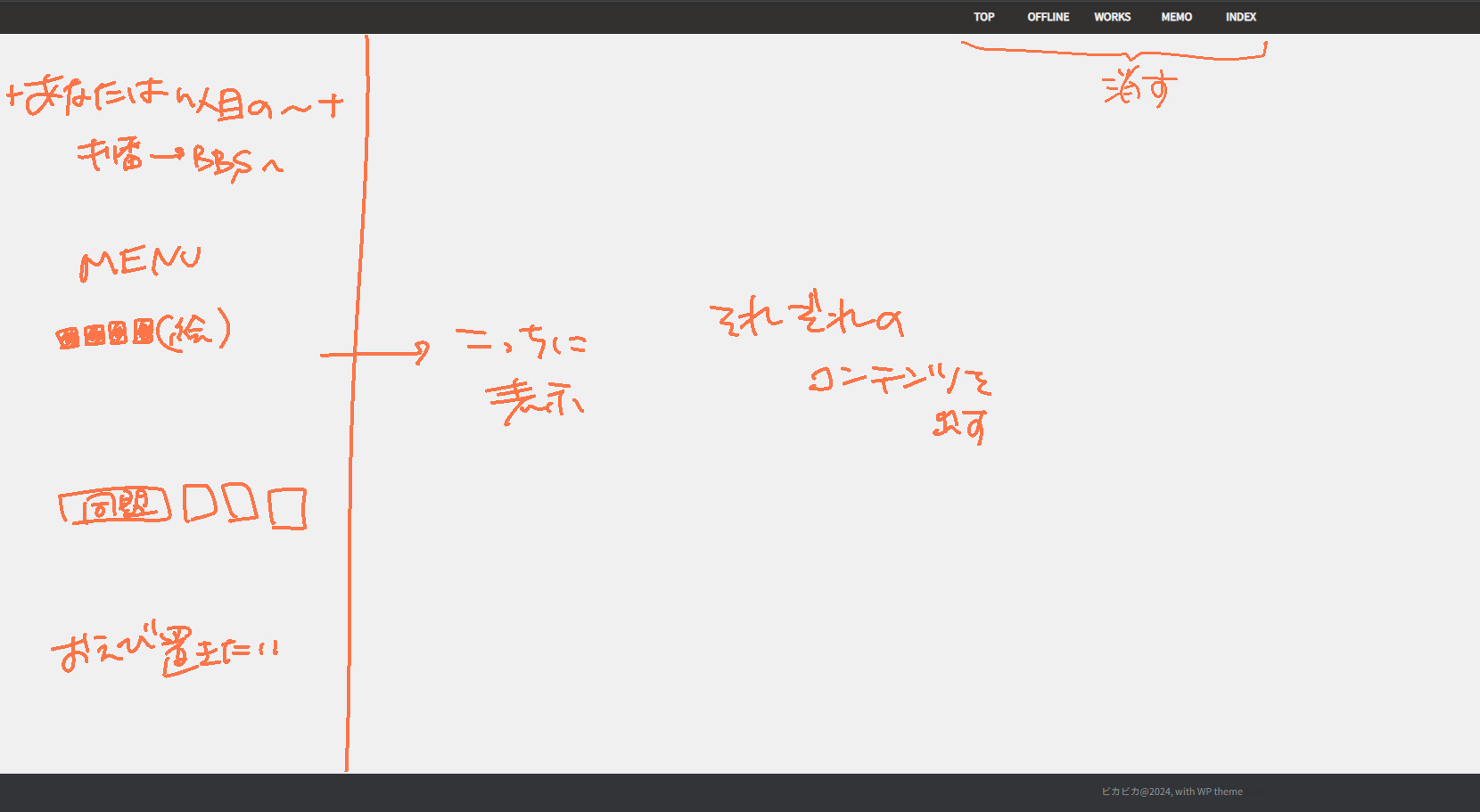 本来こういう左右分割画面はframeとかiframeというHTMLタグを使って作るのが一般的?なんですが、なんとWordpressではタグが無効になるらしい…!?プラグインを使えば出来ないことも無いけど細かい設定が難しそうだったのでお得意のFlexboxで疑似フレームページとして見せかけることにしました 左のメニューバーの右端に灰色太めの境界線を入れているだけです