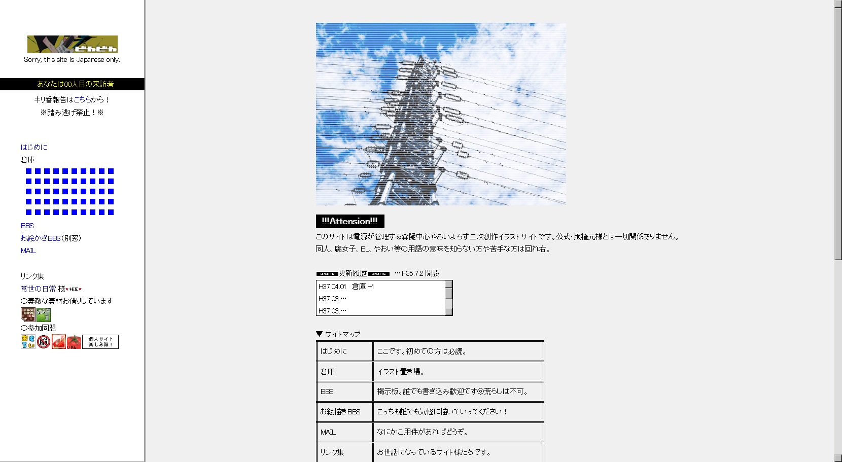 これでどうだ!!!フレームで作ったメニューバー、カウンターとキリ番報告、作品リンクは■で並べる、同盟バナーも並べて貼る、おえび(お絵描きBBS)、等…!!結構解像度高いんじゃないか?色々思い出している間にメル画とか…あったな…と思いましたがあれは別に文化であってサイトに直接関係するものではないのでパス ちょっと見てみたかったけど自分で作るのはこう、耐えられなさそうだったので やっぱりパス 誰かフランクくんのメル画あったらください